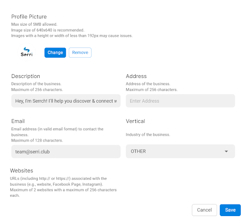 Editing your WhatsApp Business profile on Serri is easy: